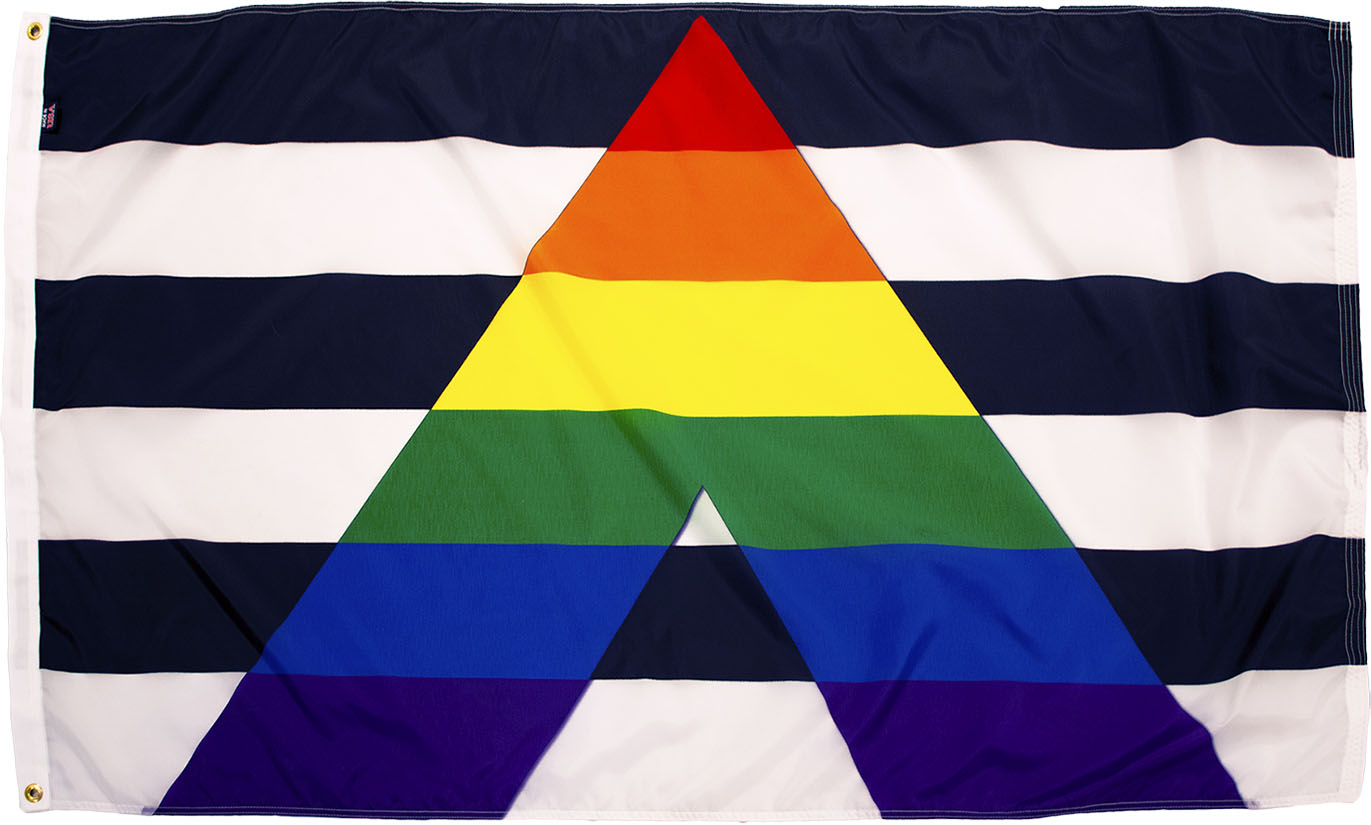 This digitally printed flag features the Ally Pride logo. The black & white stripes represent heterosexual and/or cisgender people while the rainbow in the shape of an "A" represents the LGBTQA+ community. Made with our 200 denier nylon fabric, this durable 3'x5' outdoor flag is finished with a sturdy polyester header and two brass grommets for easy attachment to your flagpole.