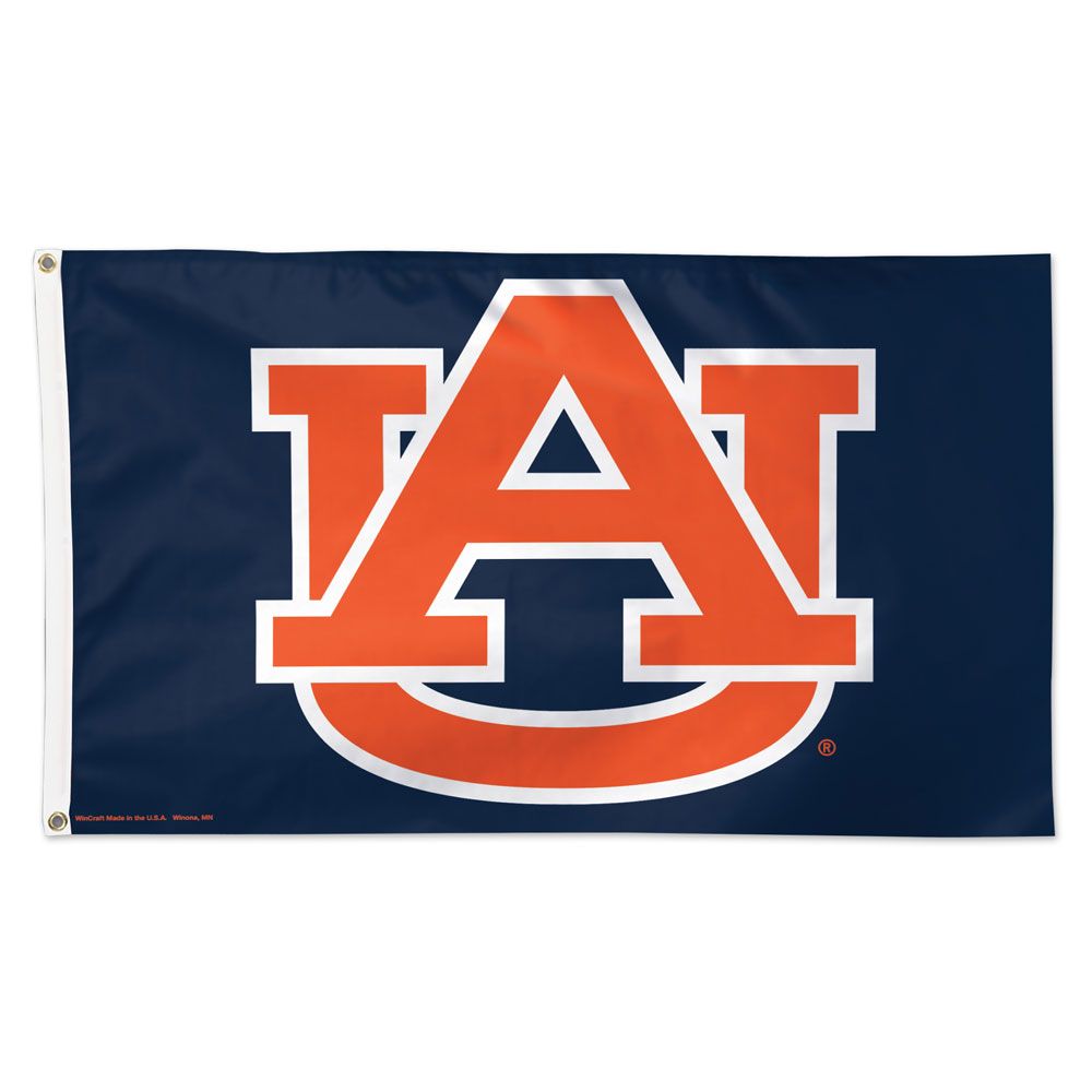 Cheer on your favorite team with this 3'x5' Auburn University Tigers team flag. This outdoor flag features a blue background with a bold AU logo in the center. Made from polyester fabric, this durable outdoor flag is printed on both sides so the design is readable from the front and reverse from the backside. Finished with a strong polyester header and two brass grommets for easy attachment to your flagpole. Officially Licensed.