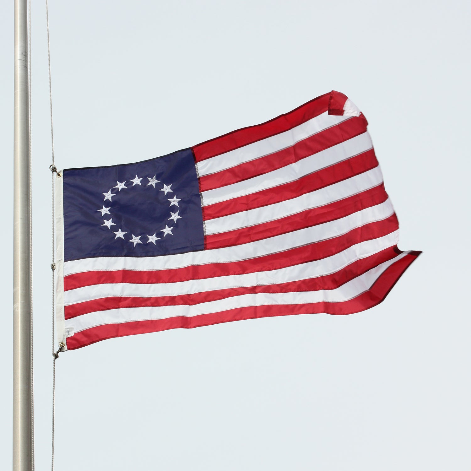 This historical 3'x5' Betsy Ross flag is made from 200 denier nylon fabric and features thirteen embroidered stars and thirteen sewn stripes. It is finished with a strong white polyester canvas heading and two brass grommets for easy attachment to your flagpole.