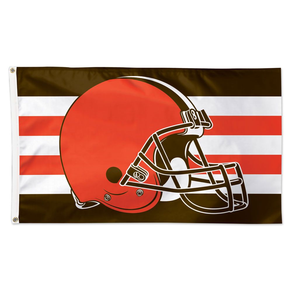 Cheer on your Cleveland Browns with this 3'x5' deluxe team flag. Made from polyester material and finished with brass grommets, this printed flag is an excellent choice for most flagpoles. Featuring a large Browns "helmet" logo on a brown, white, and orange striped background, this Officially Licensed and Made in the USA flag is sure to impress.