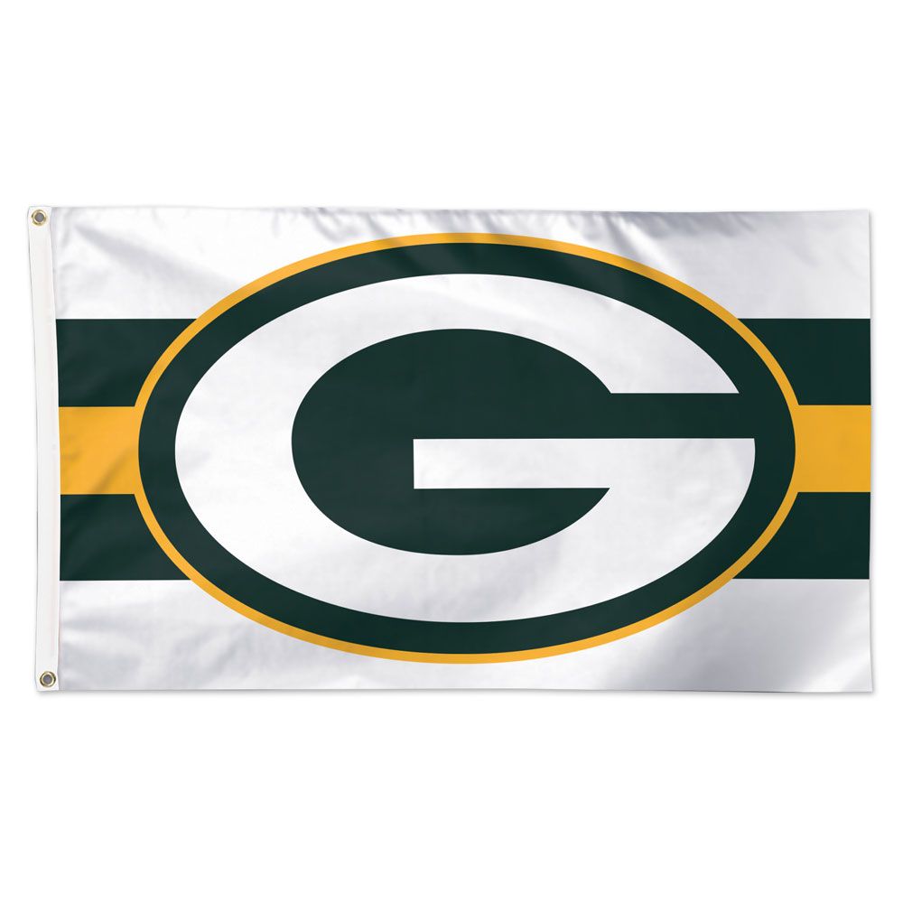 Cheer on your Green Bay Packers with this 3'x5' team flag. This design features the Packers logo on a white, green, and gold striped color rush background. Made from polyester fabric, this durable outdoor flag is digitally printed so it reads correct from the front and reverse from the backside. Finished with a strong polyester header and two brass grommets for easy attachment to your flagpole. Any time is a good time to fly your Packers flag. Officially Licensed.