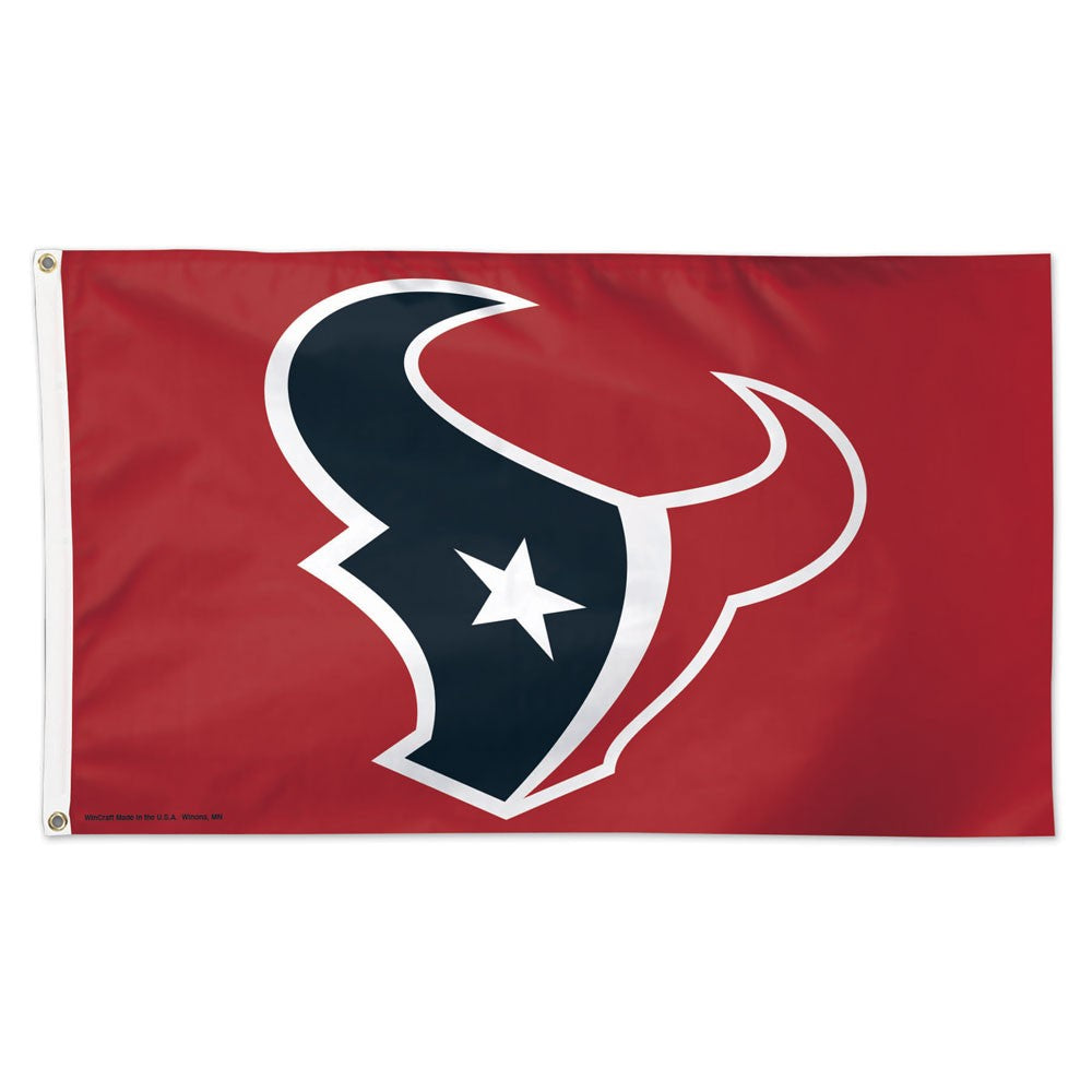 Cheer on your Houston Texans with this 3'x5' deluxe team flag. This design features the traditional Texans logo on a red background. Made from polyester material, this printed team flag is an excellent choice for flying from your outdoor flagpole. Finished with a strong polyester header & two brass grommets for easy attachment to your pole.