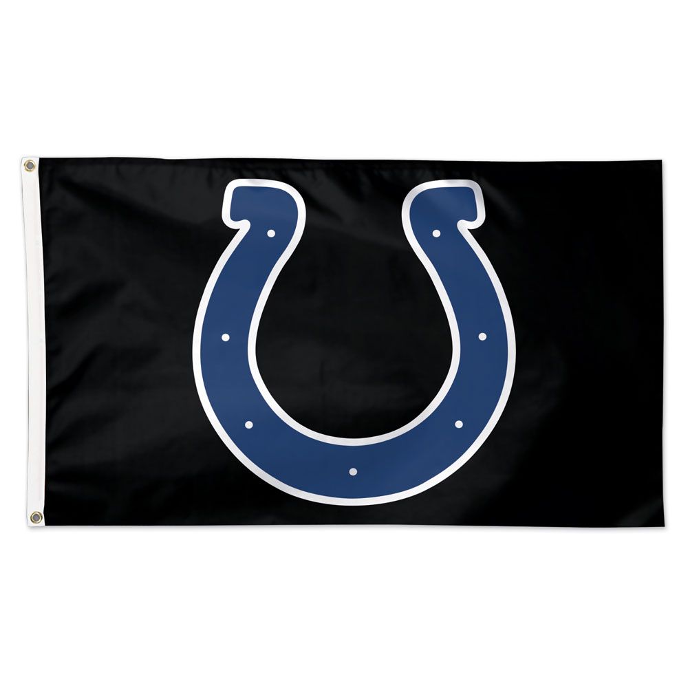 Cheer on your Indianapolis Colts with this 3'x5' deluxe team flag. This design features the traditional Colts logo on a black background. Made from polyester material, this printed team flag is an excellent choice for flying from your outdoor flagpole. Finished with a strong polyester header & two brass grommets for easy attachment to your pole.