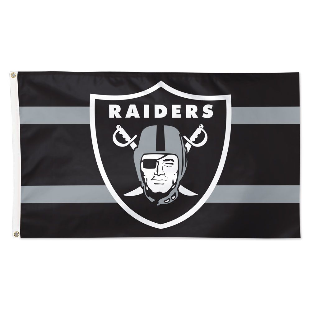 Cheer on your Las Vegas Raiders with this 3'x5' team flag. This design features the Raiders logo on a black and grey striped background. Made from polyester fabric, this durable outdoor flag is digitally printed so it reads correct from the front and reverse from the backside. Finished with a strong polyester header and two brass grommets for easy attachment to your flagpole. Any time is a good time to fly your Raiders flag. Officially Licensed.