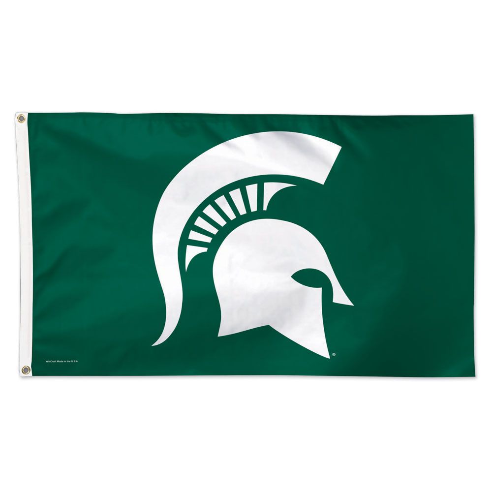 Cheer on your Michigan State University Spartans with this 3'x5' deluxe team flag. This design features the Spartans logo in White on a Green background. Each flag is made from polyester fabric with a printed design and finished with a strong polyester header and two brass grommets for easy attachment to your flagpole. Officially Licensed and Made in the USA.