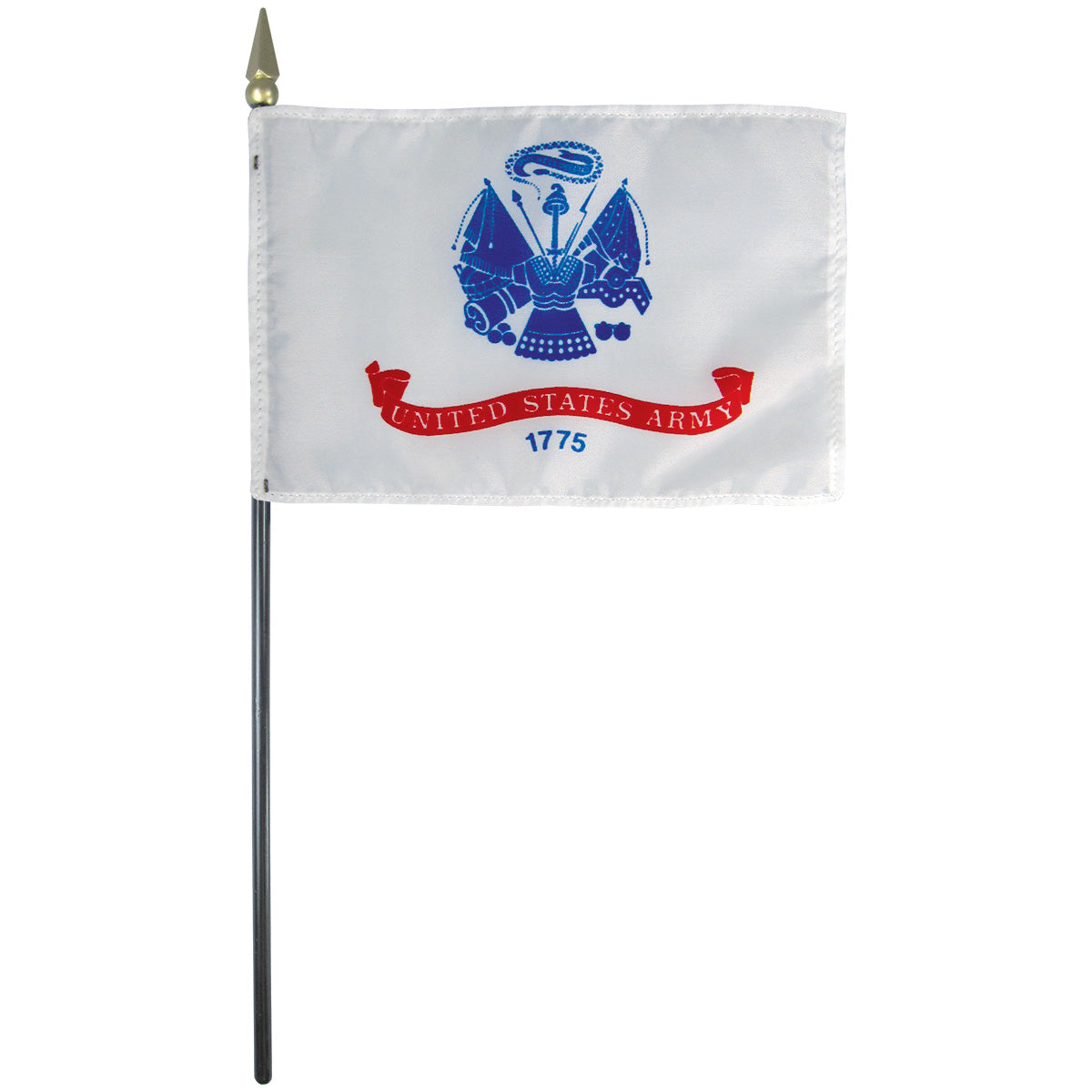 This 4"x6" handheld U.S. Army stick flag is fully printed on our Poly-Silk fabric and is finished with a sewn hem. The flag is mounted on a 10"x3/16" black plastic staff with a gold spear top ornament. Stand sold separately.