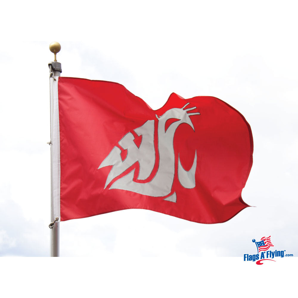 This 6'x10' Washington State University Cougars outdoor flag is fully sewn from grey and crimson nylon material. The color-retention of sewn flags is superior to printed flags, so your fully sewn WSU flag will look its best the longest. Finished with a sturdy polyester header and brass grommets for easy attachment to your flagpole. Go Cougs!