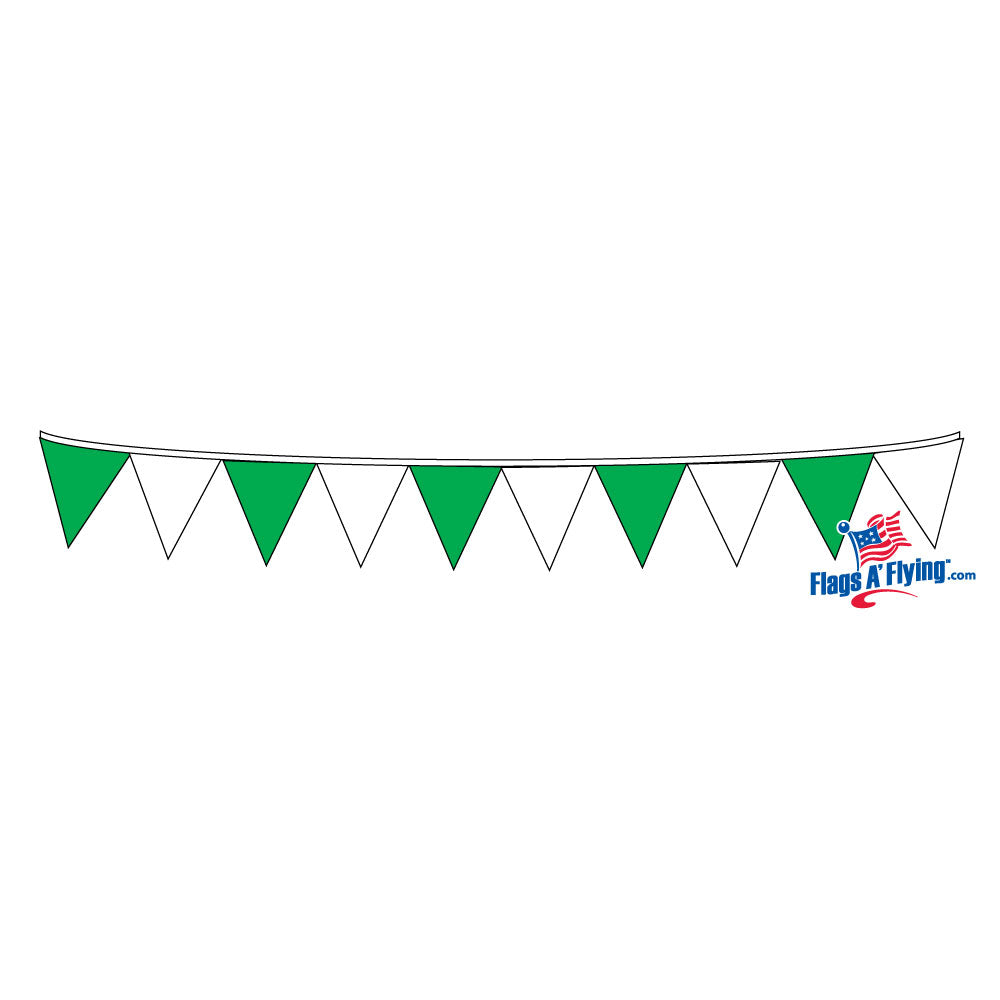 Attract attention with this colorful set of pennants. Made from 4 gauge virgin polyethylene, this 120' long strand includes 100 alternating green & white pennants per string and tie off cords on both ends to attach to your building or structure. Pennant strings are ideal for a variety of outdoor or indoor applications including parking lot use, auto dealer lot decor, events, and so much more. Shop additional color options for this style pennant string here.