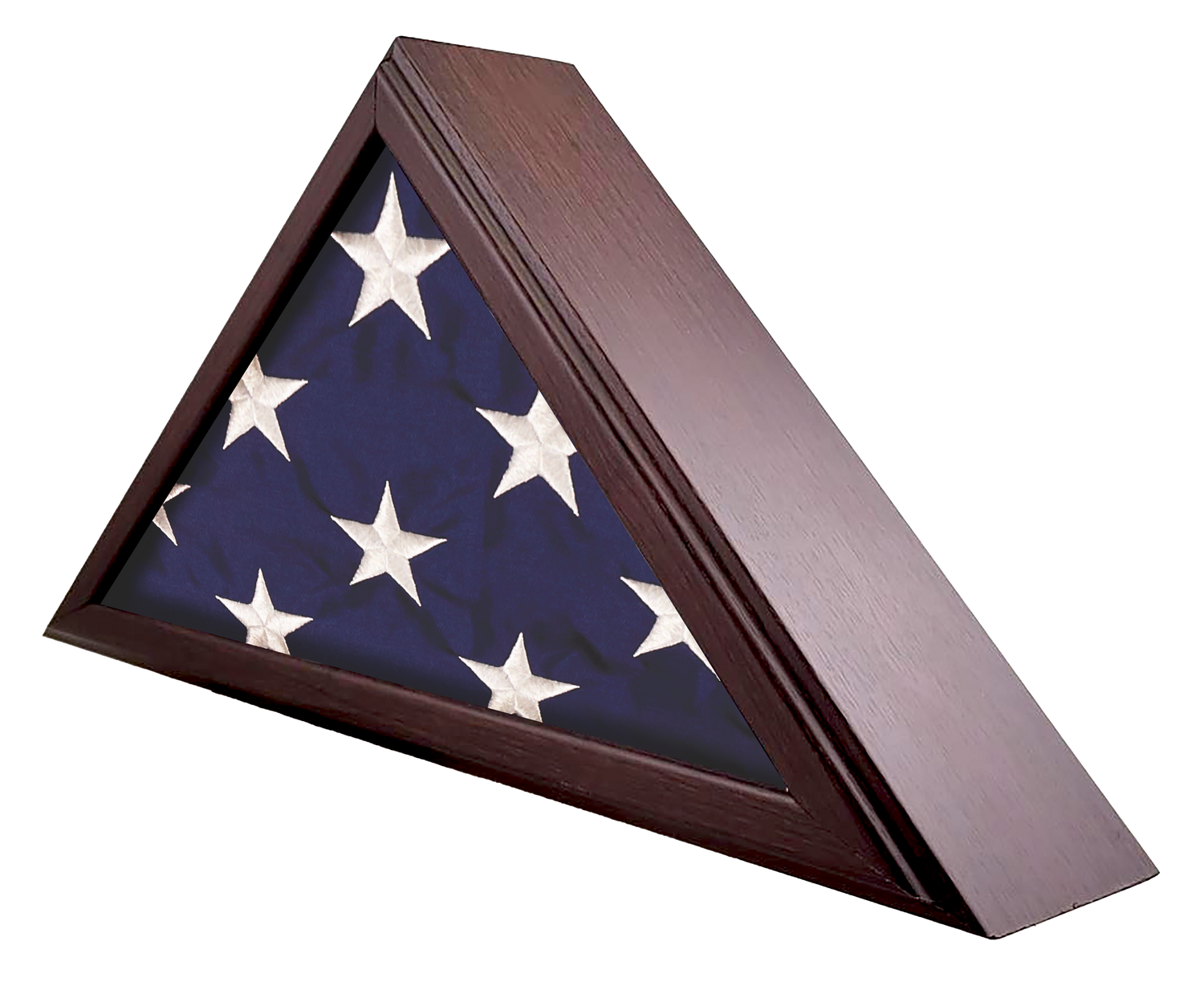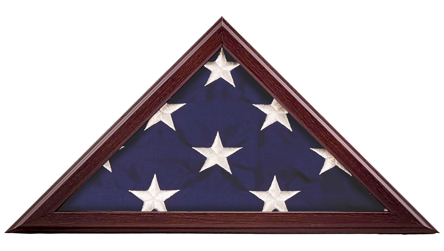 This cherry finish economy flag case is made from manufactured wood with a sedona vinyl veneer finish. Includes a glass front, removable back panel with turn-button closure. Designed for 3x5 Flag.