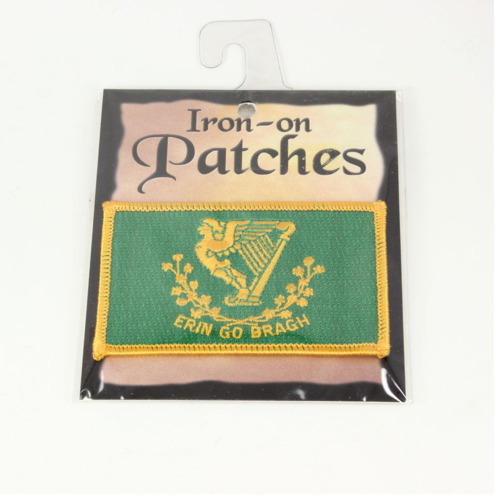 This iron-on flag patch features the Ireland flag with it's green background and gold border. Measures 2.25"x3.5".