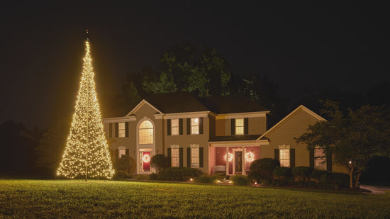 Convert your 20' flagpole to a festive Christmas Tree with our flagpole Christmas tree conversion kit. This kit features 1200 LED count white lights to create a beautiful outline of a Christmas tree. Easily attach and hoist up the light kit on telescoping, external or internal halyard style flagpoles. Accessories including stakes included.