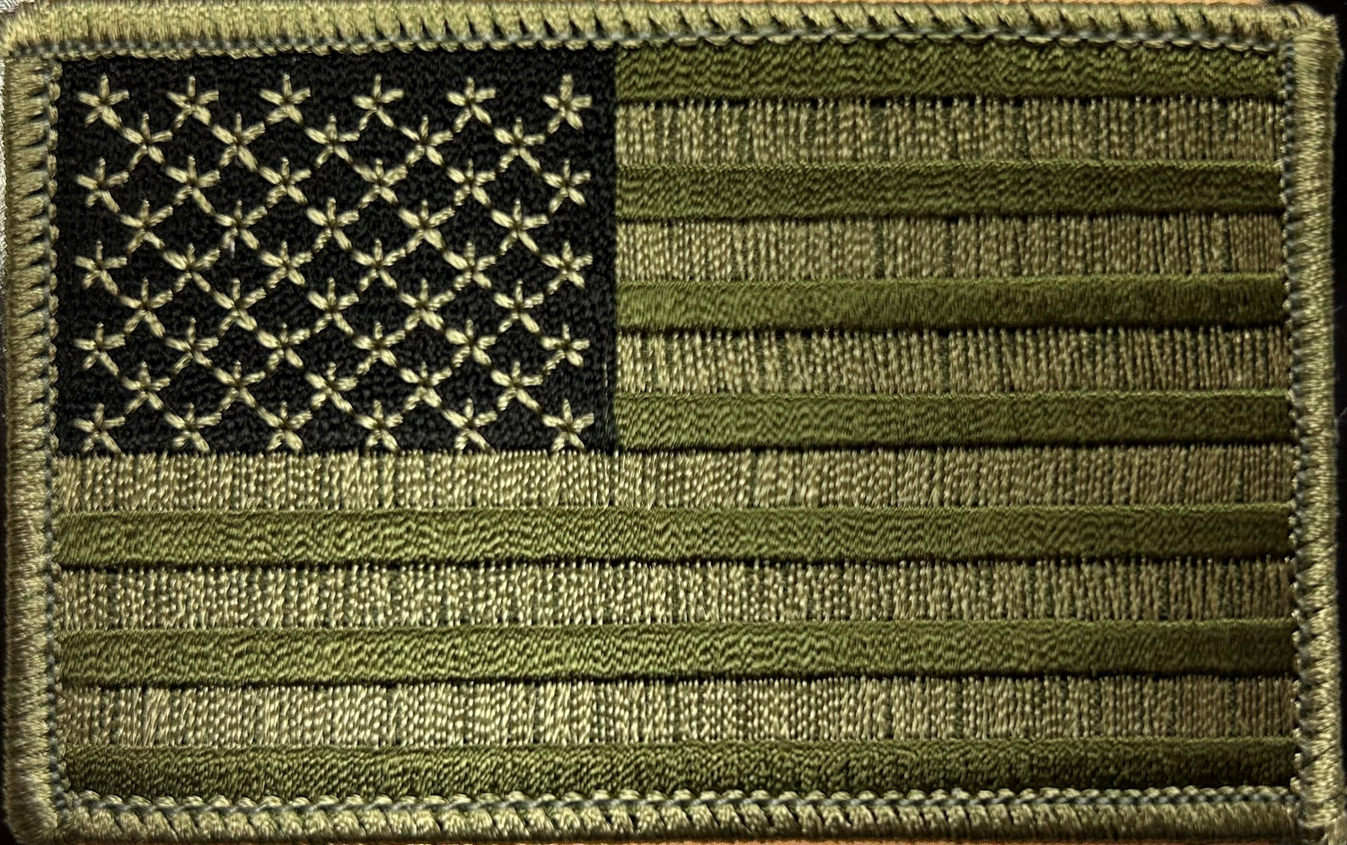 This United States iron-on flag patch features Old Glory in an Army green version with a green border. Available in this right hand version and a right hand version. Measures 2.25"x3.5".