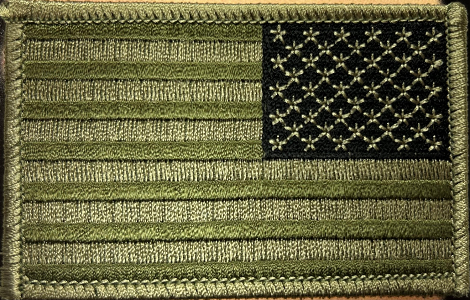 This United States iron-on flag patch features Old Glory in an Army green version with a green border. Available in this right hand version and a left hand version. Measures 2.25"x3.5".